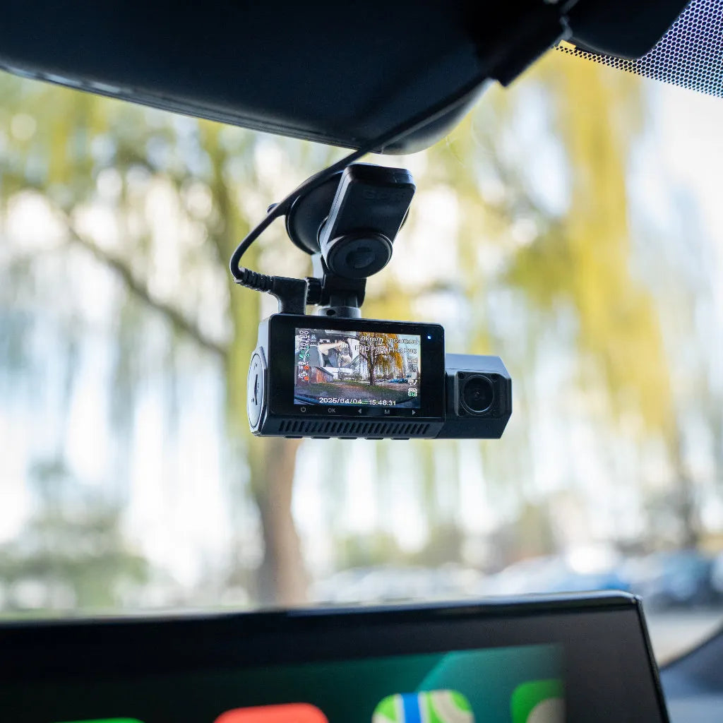 Przednia kamera rejestruje obraz w rozdzielczości 4K z szerokim kątem widzenia 170°, co gwarantuje szczegółowe ujęcia drogi. Tylna kamera, skierowana na wnętrze pojazdu, nagrywa w jakości 1080p z kątem widzenia 140°, rejestrując również dźwięk. Kamera kabinowa wyposażona jest w diody IR co gwarantuje, że na nagraniu będą widoczne detale w każdych warunkach, nawet podczas nocnej jazdy poza miastem.